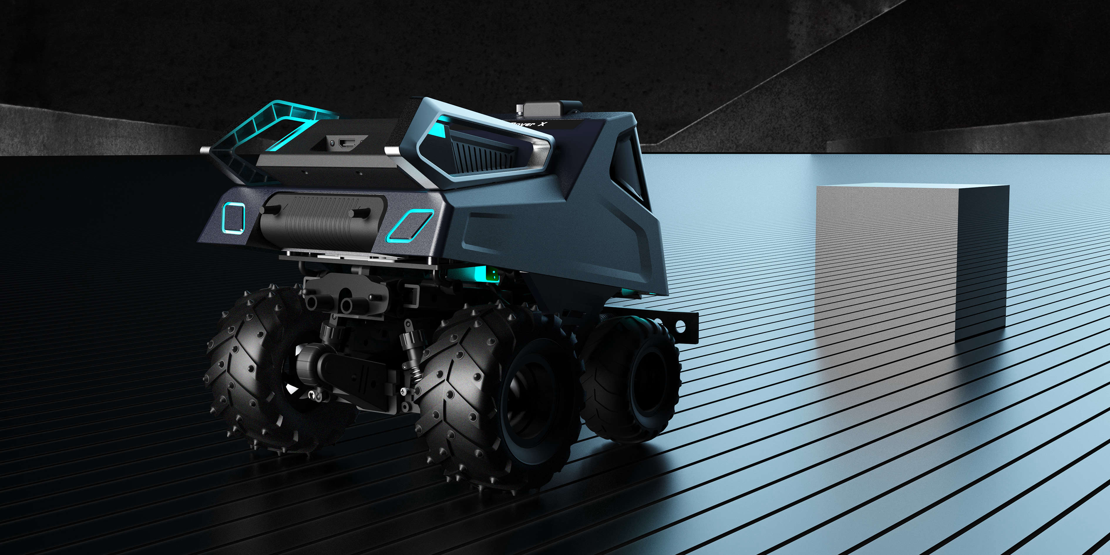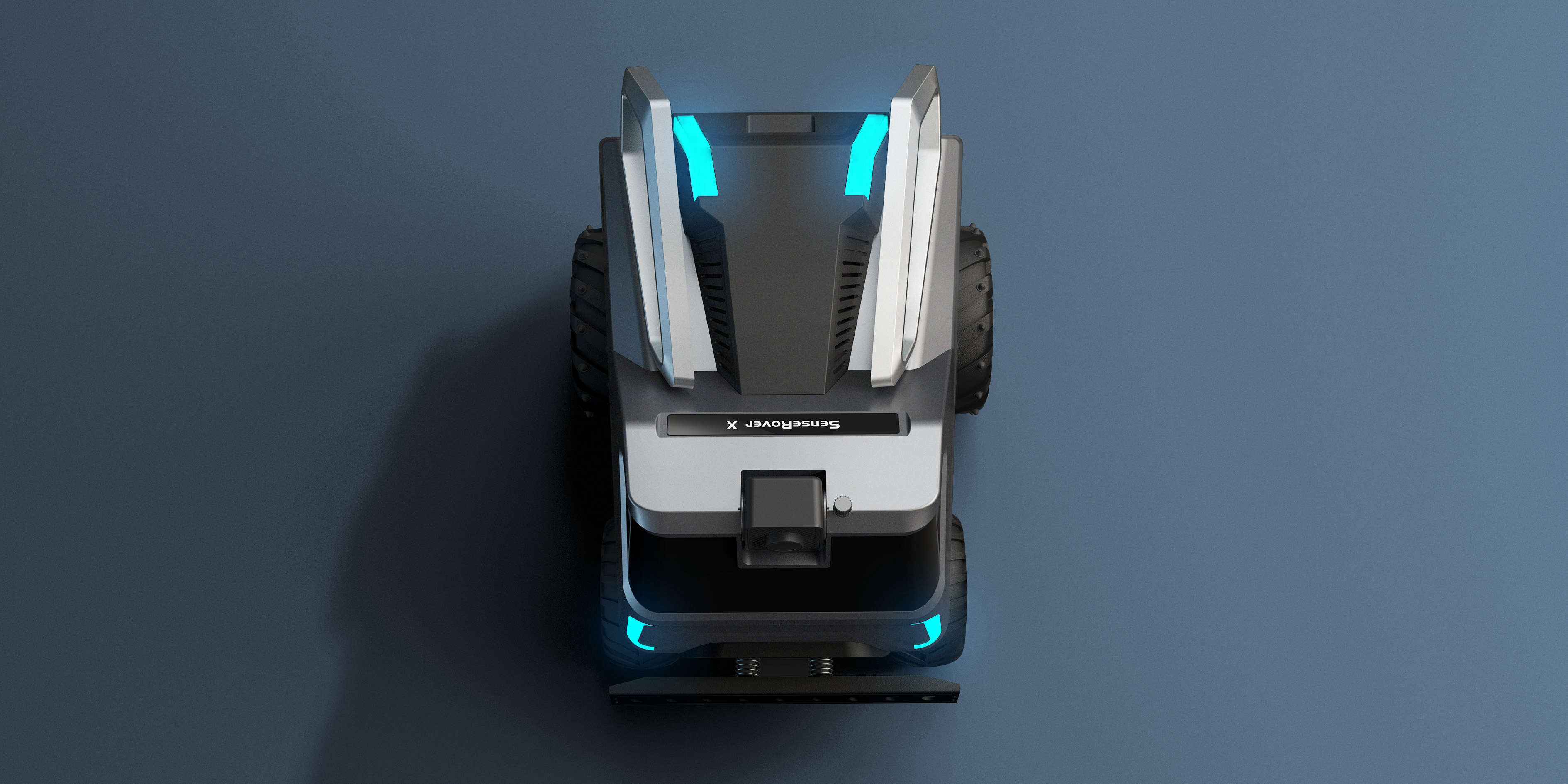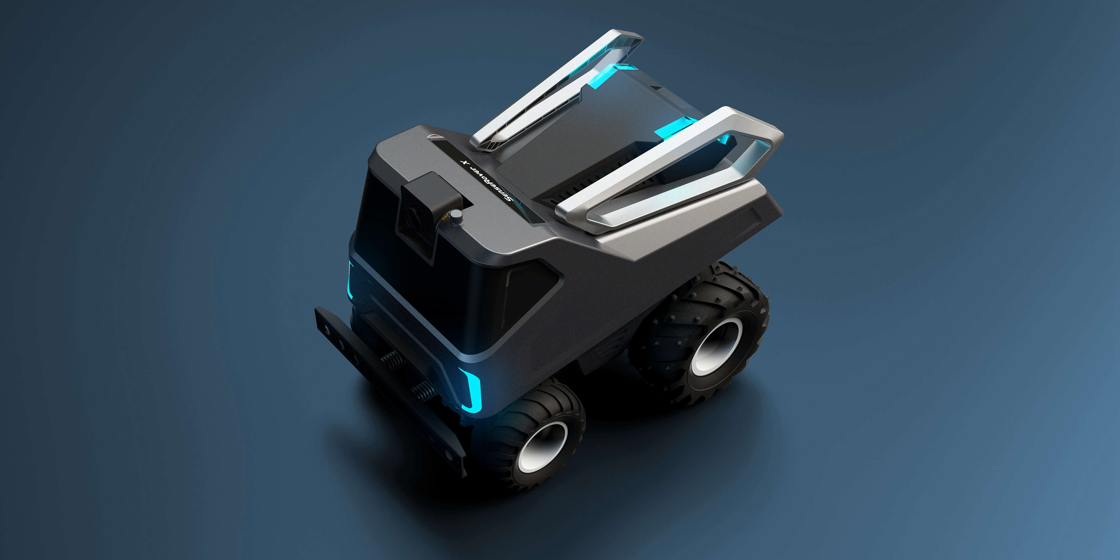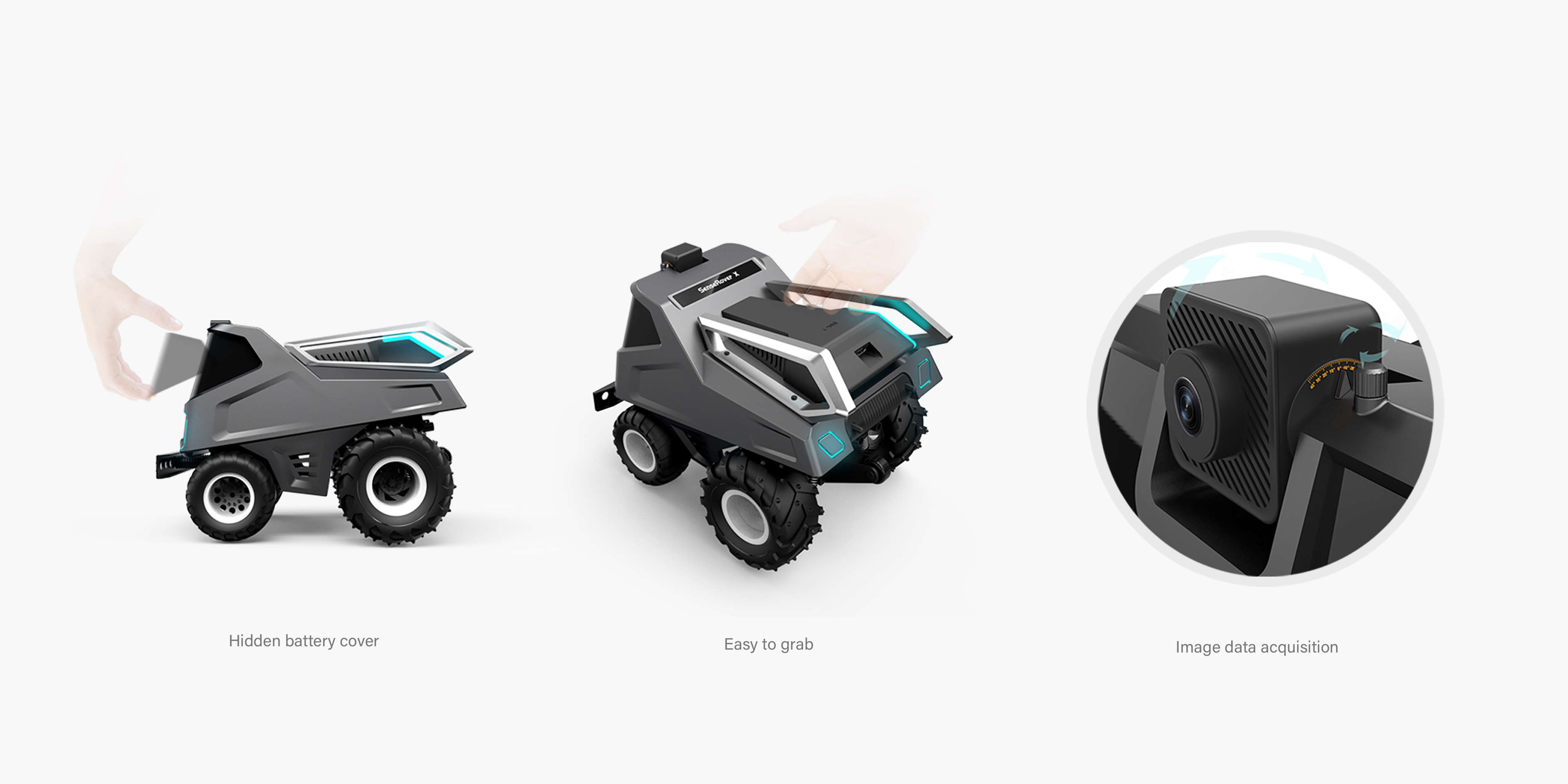 在外觀造型上以科技+輕盈為主題采用仿生設(shè)計(jì)手法,以“蟬”為基礎(chǔ)形態(tài)。車體前臉的大面積視窗主要功能方便電池的取出而又不失科技感。背部兩翼金屬支架模擬蟬的翅膀,主要功能是方便車體被拾取;槍灰色的金屬質(zhì)感與燈光的運(yùn)用其目的也是為了突出該產(chǎn)品的未來感。